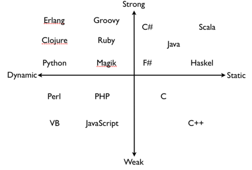 동적타입언어, 정적타입언어와 강타입언어, 약타입언어는 완전히 다른 개념이다.
