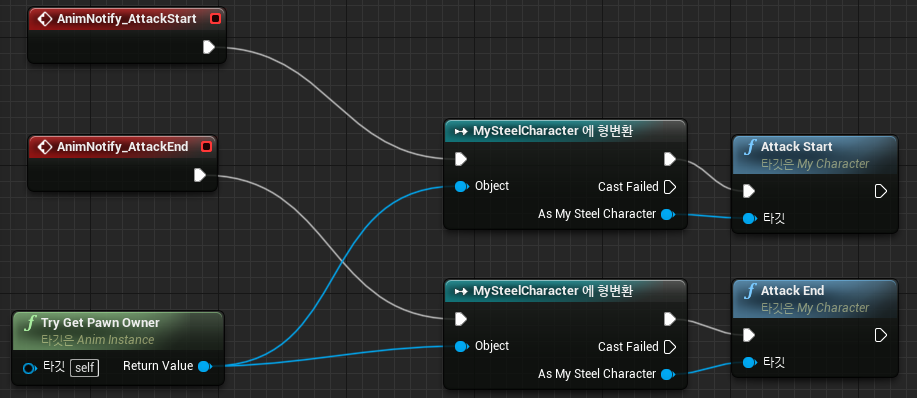 애니메이션 몽타주 블루프린트에서 notify를 받을 시 c++ 코드에 정의된 함수를 호출해주도록 한다.