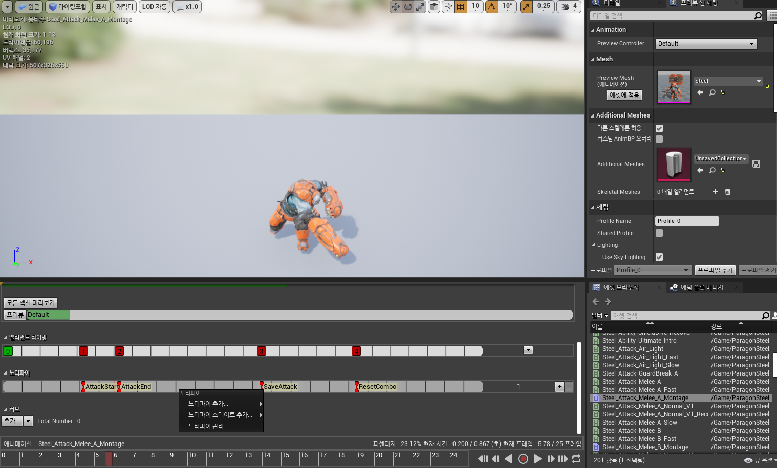 애니메이션의 특정 상태에서 notify 이벤트를 발생시키도록 AttackStart, AttackEnd notify를 생성해준다. AttackStart는 공격을 위해 주먹을 높이 든 상태이고, AttackEnd는 공격 충돌 판정의 끝 상태이다.