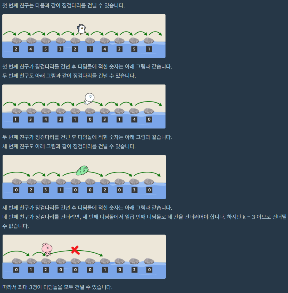 해당 값에 대하여, 반복문을 돌며 stones[i] - mid <= 0 인 경우가 연속 k번 반복된다면 실패.
