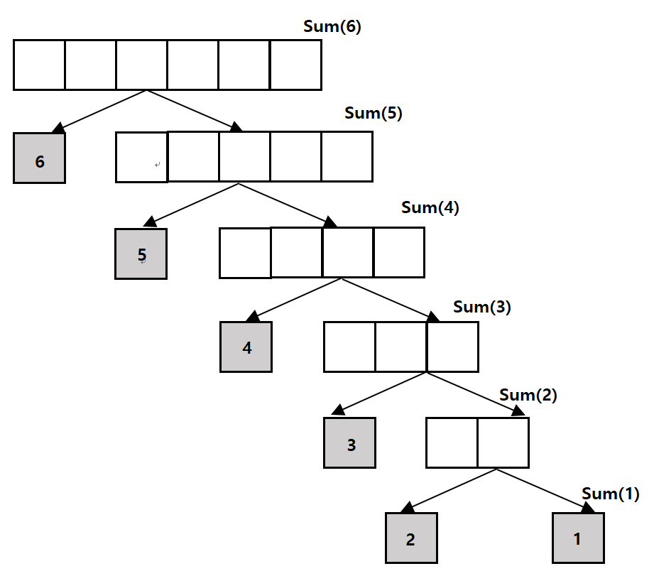 이 코드를 보면, 전체 목표 작업인 [1,N] 까지의 합을 N + [1, N-1] 까지의 합의 형태로 분할하여 정의한 것을 확인할 수 있다. N이라는 값을 더하는 부분이 쪼개진 한 조각이고, 나머지 [1, N-1]은 다시 자기자신의 형태를 빌려 Sum(n - 1)로 표현한다. 이 코드는 다음과 같은 그림으로 호출된다.