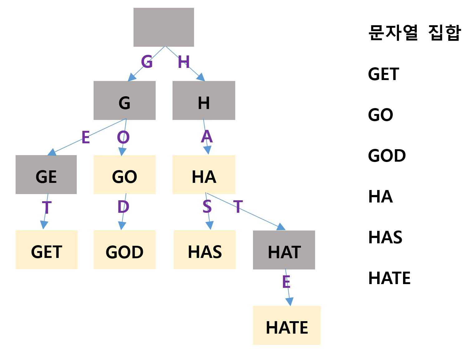 다음 그림은 문자열 집합 S = { "GET", "GO", "GOD", "HA", "HAS", "HATE" } 를 저장하는 트라이이다.