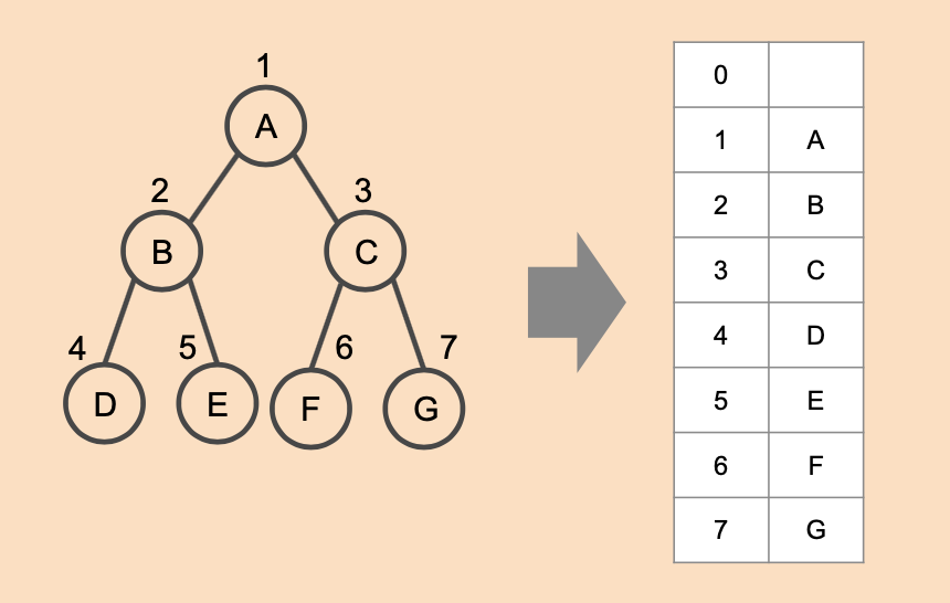 루트 노드를 배열의 1번 원소로 두고, i번째 노드의 두 자식 노드는 (2 * i)과 (2 * i + 1)번 노드로 표현할 수 있다.