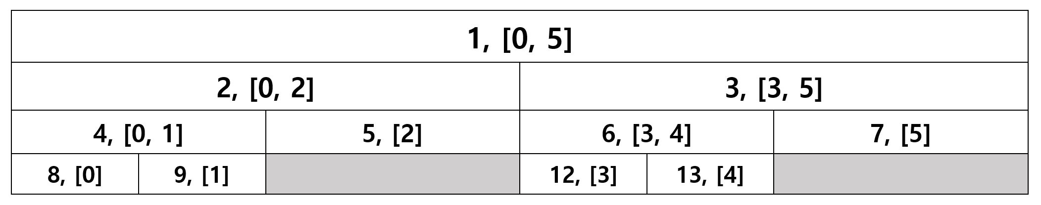 다음 그림은 n이 6인 경우의 구간트리의 모습이다. (노드번호, [범위])
