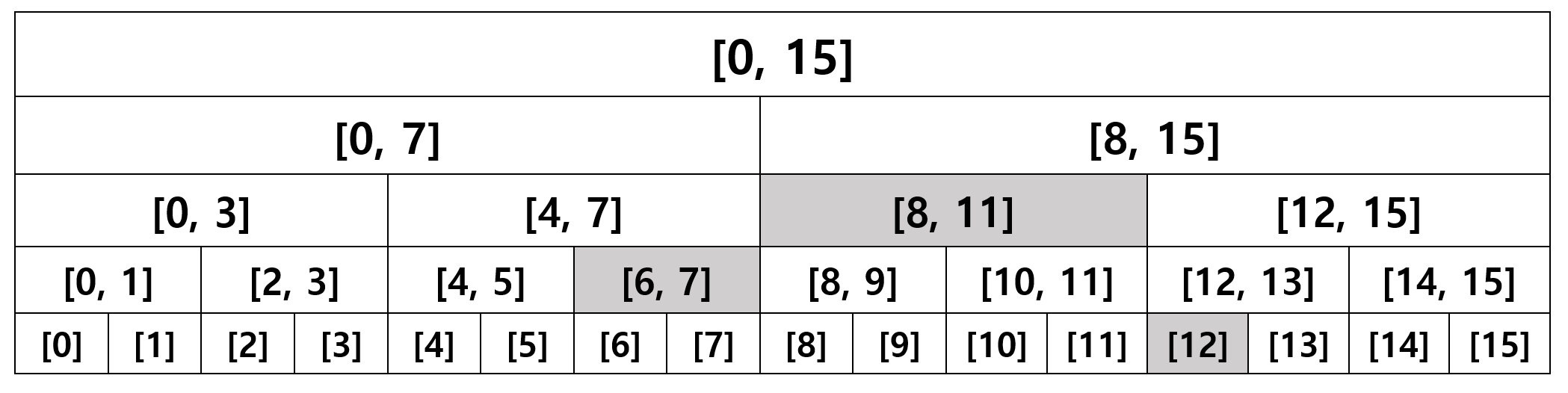 이런 전처리 과정을 수행해 두면, 어떤 구간 [i, j]가 주어지더라도 이 구간을 구간 트리의 노드에 포함된 구간의 합집합으로 표현할 수 있다. 예를 들면 위 배열에서 [6, 12] 구간은 진하게 색칠된 세 구간 [6, 7], [8, 11], [12, 12]의 합집합으로 표현이 가능하다.