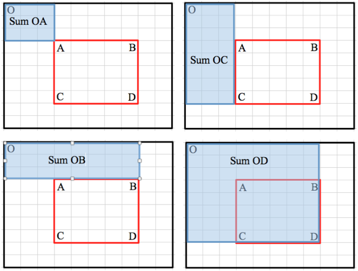 그림처럼 위치 O(0, 0) 부터 위치 D까지의 직사각형 구간의 합 Sum OD에서,