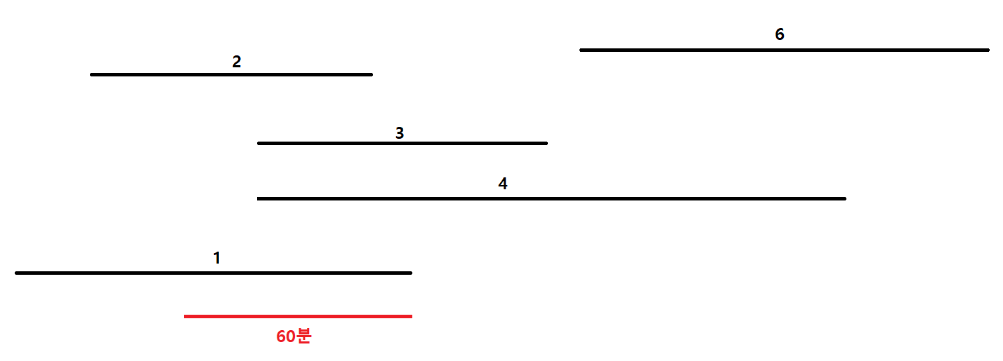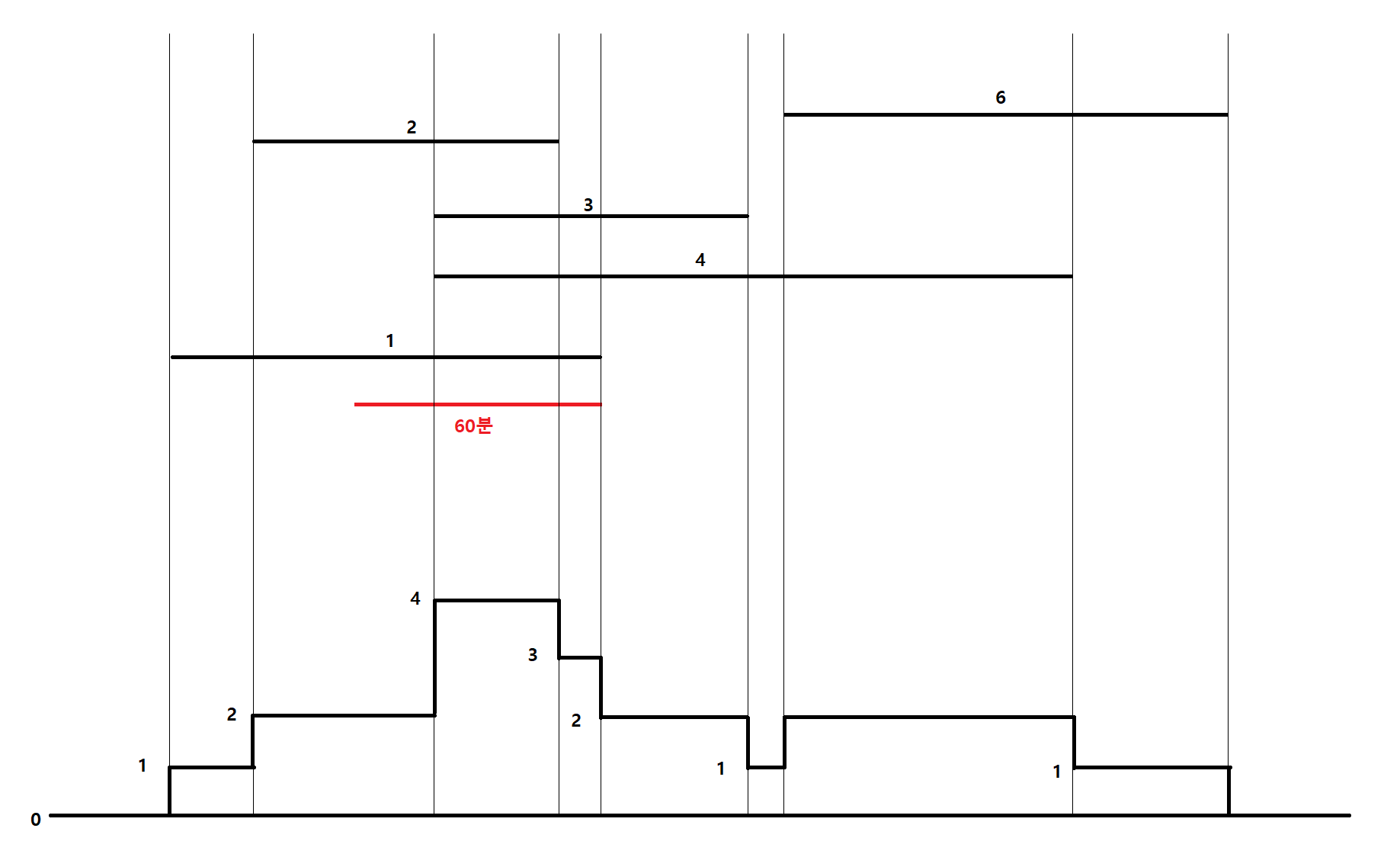 한 시간 구간동안 사람이 몰리는 정도는 30 * 2 + 30 * 1 = 90이 된다.