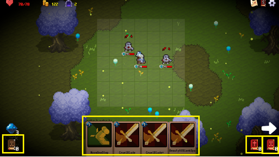 카드 더미는 손 카드 더미(Hand Cards Pile), 뽑을 카드 더미(Draw Cards Pile), 버려진 카드 더미(Discarded Cards Pile), 제외된 카드 더미(Excluded Cards Pile)로 구성된다. 다음 이미지는 왼쪽에 뽑을 카드 더미, 가운데에 손 카드 더미, 오른쪽에 제외된 카드 더미와 버려진 카드 더미를 나타낸다.