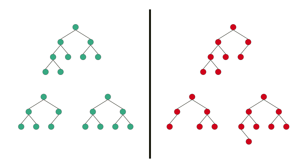 기본적으로 힙은 완전이진트리에 속한다. 이진트리중에서도 마지막 레벨의 오른쪽부분을 제외하고 모든 노드가 꽉 찬 이진트리를 완전이진트리라 부른다. 다음 그림 중 좌측 트리들은 완전이진트리이고, 우측 트리들은 완전이진트리가 아니다.