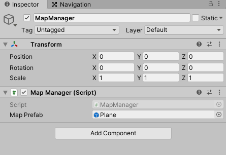 코드 작성 후 inspector에서 _mapPrefab에 Plane Prefab을 넣는다.