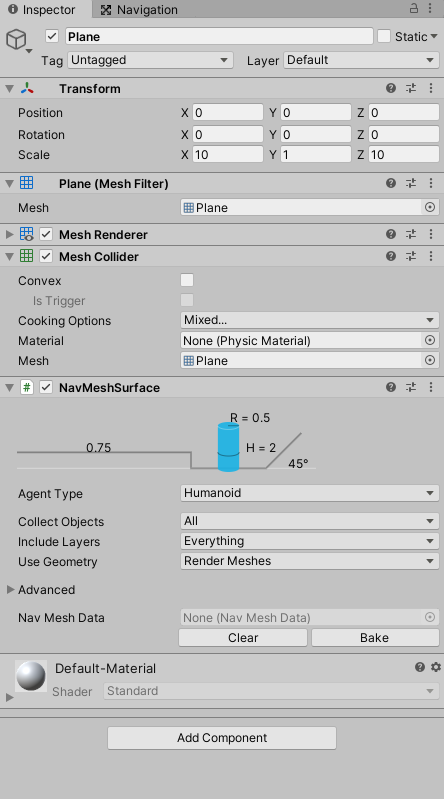 그 후, NavMesh를 위한 Floor로 사용할 GameObject에 NavMeshSurface 컴포넌트를 붙인다.