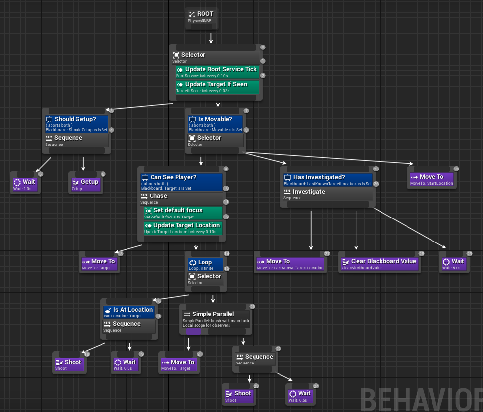 예를 들어 위 BehaviorTree에 "Can See Player?" 라는 Decorator가 정의되어 있는데, 이는 현재 target 변수가 유효한지 체크한다. 그래서 조건이 유효한 경우에만 하위에 행동들을 수행하도록 할 수 있다.