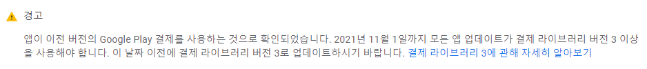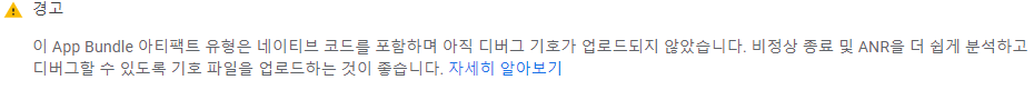 11. Google Play Console 내부 테스트 중 앱을 업로드 하였을 때, 다음과 같은 경고문이 나타날 수 있다.