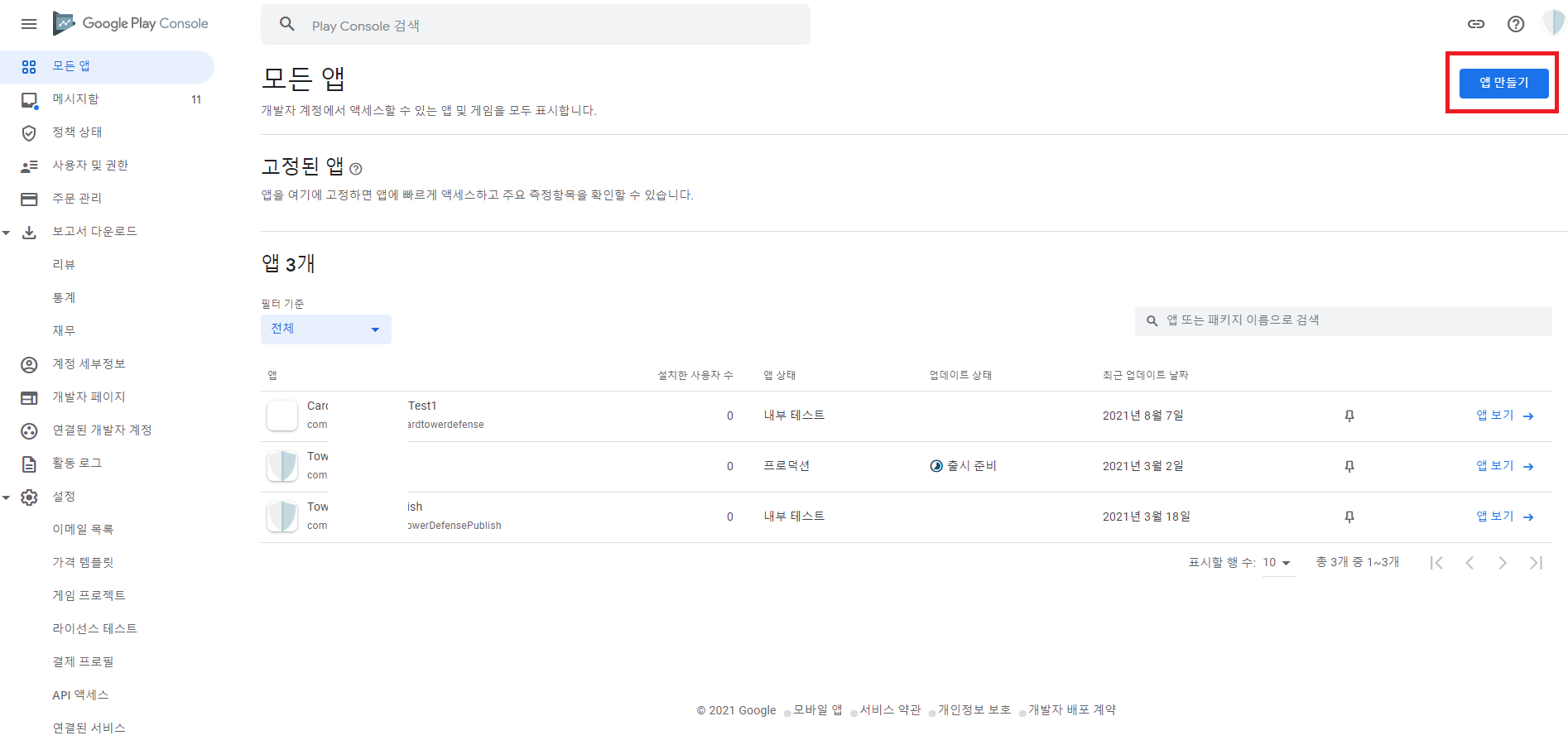 개발자 계정이 생성되었다면, 구글 플레이 콘솔을 통해 앱을 게시할 수 있다. 먼저 왼쪽 위에 모든 앱 메뉴를 선택한다. 왼쪽 위에 앱 만들기 버튼을 누른다.